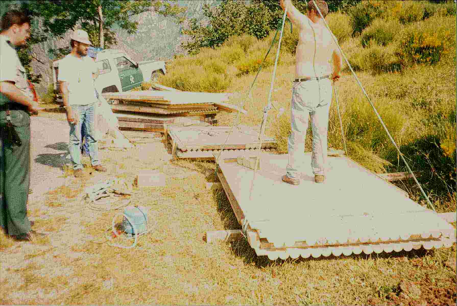1996 CABAÑA EN EL PARQUE DE SOMIEDO ARRIBA: EDUARDO TENSA LAS CUERDAS Y "EL HOMBRE DEL SOMBRERO DE PAJA" SUPERVISA. EL AGENTE DEL SEPRONA OBSERVA DERECHA: EDUARDO CURRANDO - EL SOMBRERO DE PAJA SE LO LLEVÓ EL REMOLINO DEL HELICOPTERO - AL FONDO, ROMAN, LISTO PARA DESENGANCHAR UNA CARGA - EL QUE OBSERVA SENTADO ES EL GUARDAMONTES. |